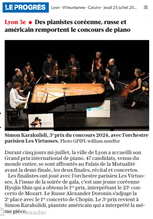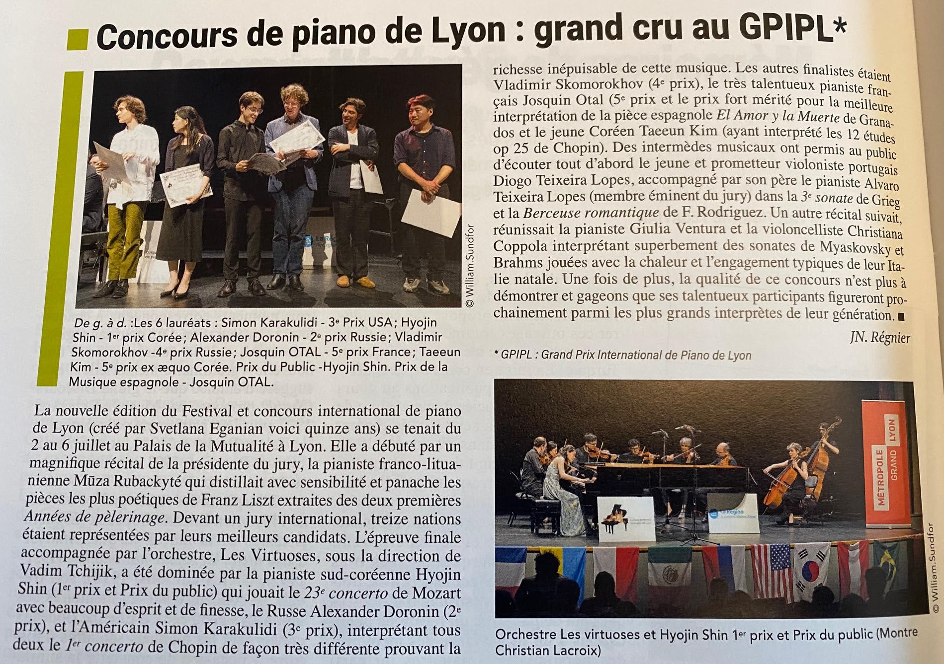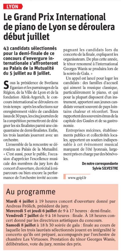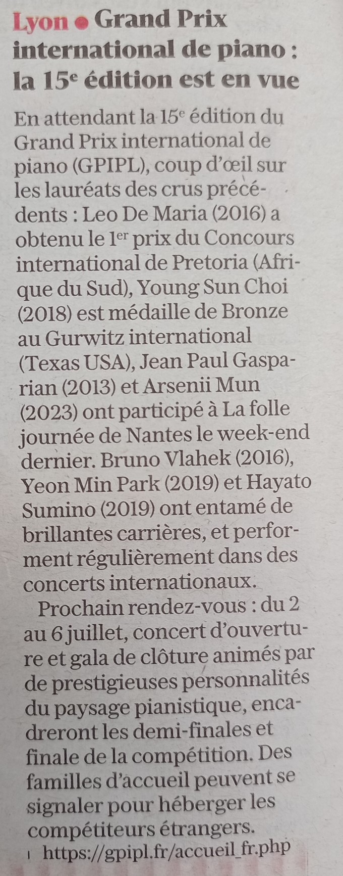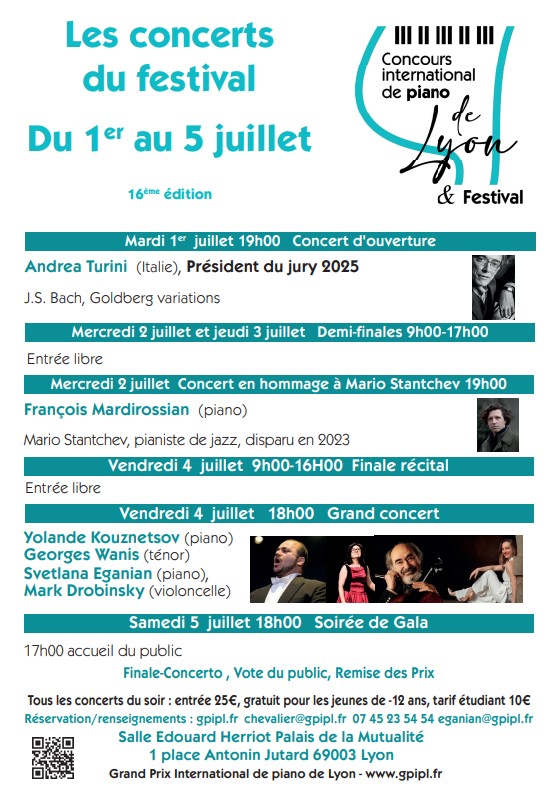 Le 4 juillet : -14h : accueil des candidats du 13ème Concours International de Piano de Lyon